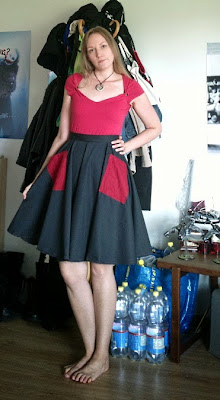 I am really, really fond of the pockets in this skirt. And I love how well the whole thing turned out. Although, doing that much detail really takes its toll, time-wise, as it took me altogether about 9 hours to finish this skirt. So this wasn't a walk-in-the-park kind of easy sewing project. Sewing the bias tape on and only then adjoining the pieces of fabric is a massive amount of work in comparison to just slapping two pieces of fabric together and sewing them together. Still, despite the time and effort it took to finish this project, I'm actually thinking about making more stuff with detailed seams in them... They add a nice touch to clothing. ^_^