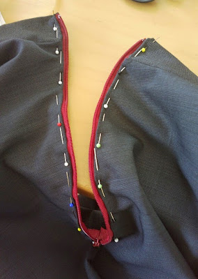 ...so just pin it down, holding onto the visible small edge of the bias tape / piping and pulling down the lining and the wool.